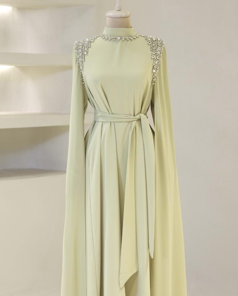 Pistachio Green Floor-Length Mermaid Silhouette Evening Dress Beaded Shoulder Embellishments Flowing Cape Sleeves Breathable