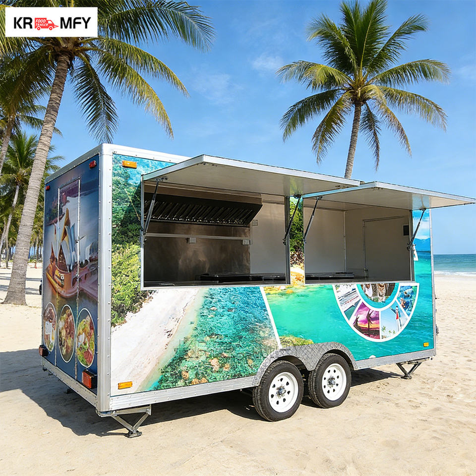 รถพ่วงขายอาหารเคลื่อนที่พร้อมอุปกรณ์ครบครันสำหรับพิซซ่า เบอร์เกอร์ มันฝรั่งทอด และไฟเบอร์กลาส