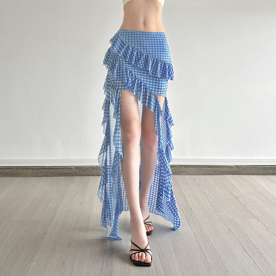 กระโปรงยาวทรงเอ midi ลายสก็อต ผ้าตาข่าย เอวสูง ชายระบายแบบไม่สมมาตร ผ่าข้าง ทรงเข้ารูป พลิ้วไหว สไตล์เรโทร