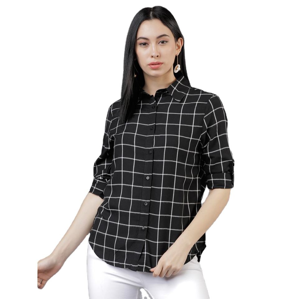 เสื้อเชิ้ตลายตารางแขนยาวสำหรับผู้หญิง,เสื้อเบลาส์แฟชั่นลายสก็อตติดกระดุมน่ารัก
