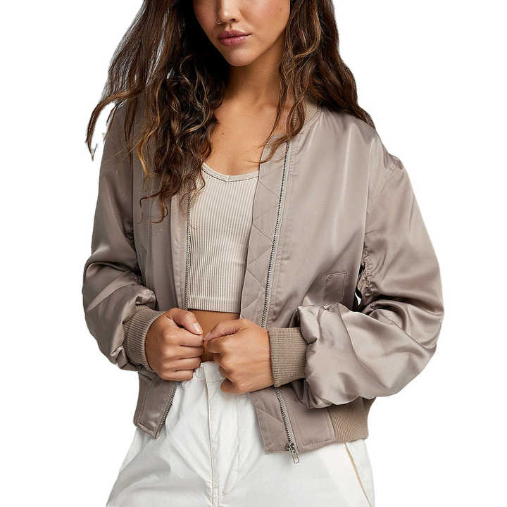 แจ็คเก็ตบอมเบอร์ผู้หญิงสำหรับฤดูหนาว ผ้าระบายอากาศ กันน้ำ พิมพ์ลายเรียบๆ ไม่มีลวดลาย พร้อมซิปปิด รับสกรีนโลโก้ สินค้าขายดี แฟชั่น