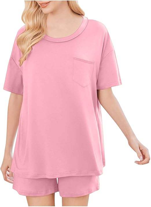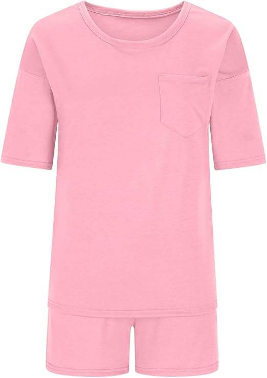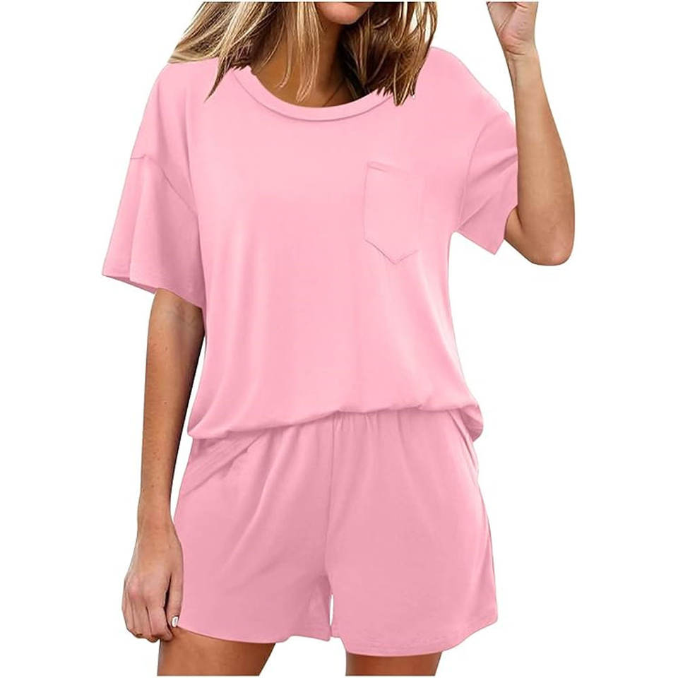 ชุดเสื้อยืดและกางเกงขาสั้นสีพื้นเรียบง่ายสำหรับผู้หญิง ดีไซน์แฟชั่นล่าสุด ระบายอากาศได้ดี สวมใส่สบาย ชุดลำลองสำหรับผู้หญิง
