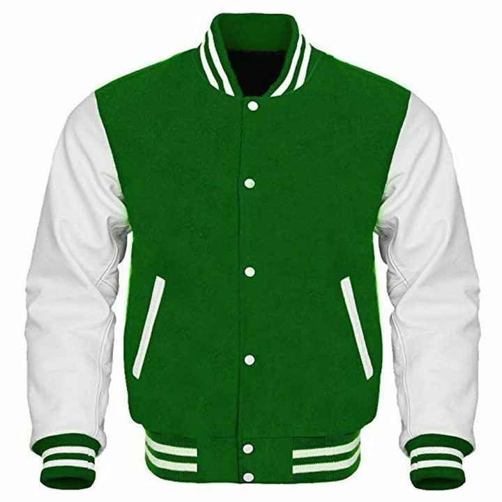 เสื้อแจ็คเก็ตเบสบอลแบบวาร์ซิตี้สั่งทำพิเศษสำหรับผู้ชาย คอตั้ง ผ้าแคนวาสสีเขียวล้วน แขนสีขาว