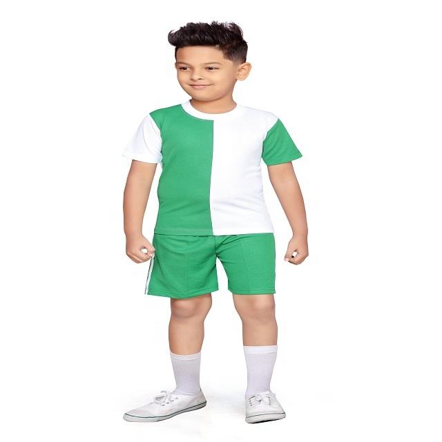 ชุดกีฬาสีเหลืองล้วนเสื้อยืดเด็กผู้ชายสำหรับแขนสั้นกางเกงขาสั้นสีเขียวออกแบบโลโก้ได้ตามต้องการ
