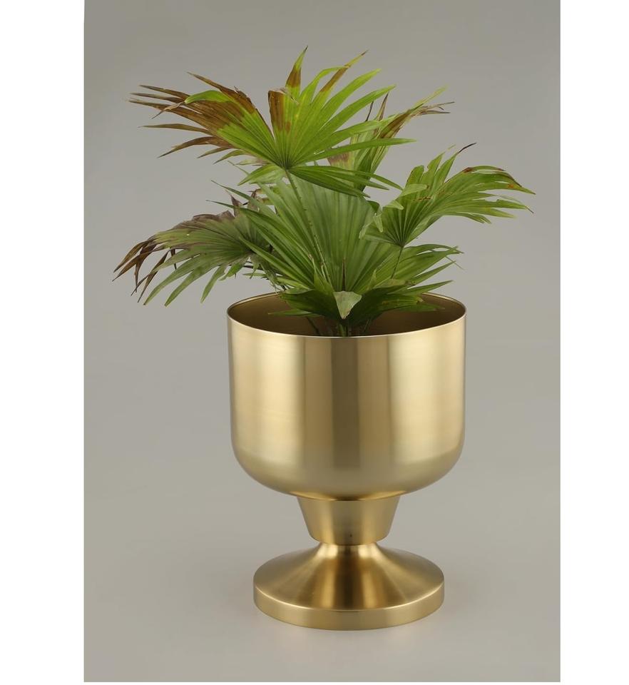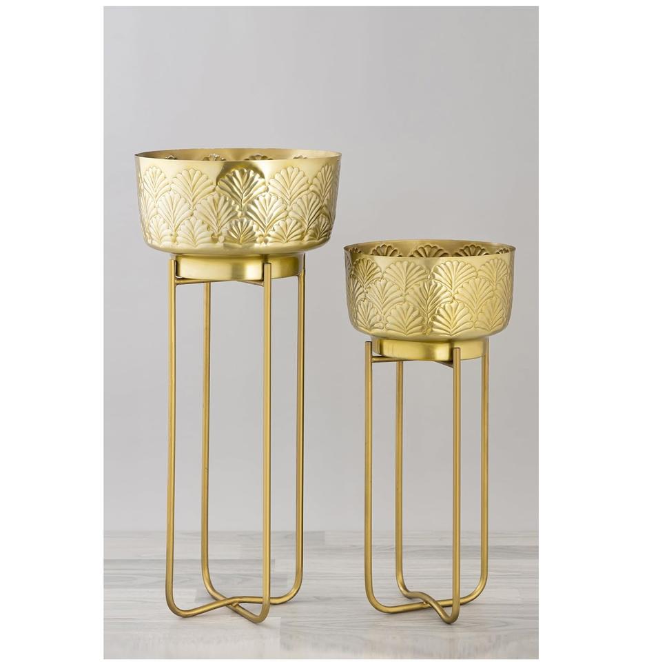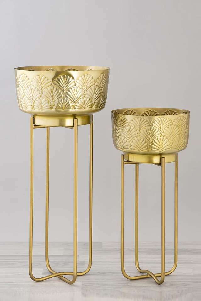 ที่ปลูกต้นไม้ในร่มแบบทันสมัยกระถางต้นไม้ทองเหลืองสลักลายนูนพร้อมขาตั้งกระถางต้นไม้โลหะสีทองสำหรับตกแต่ง