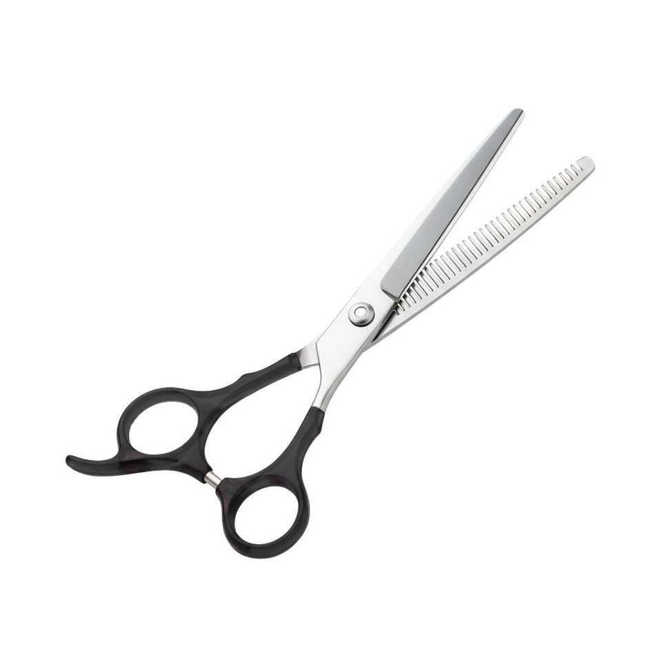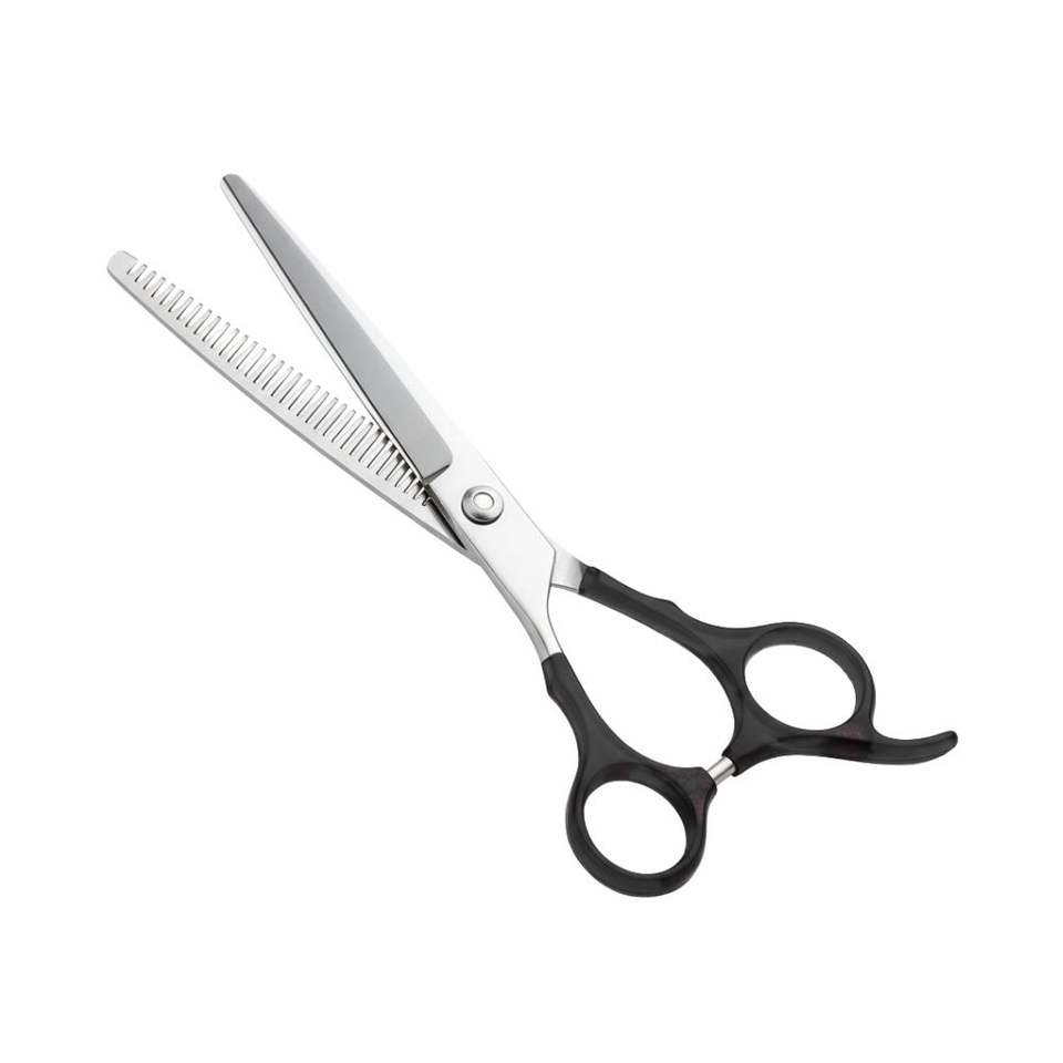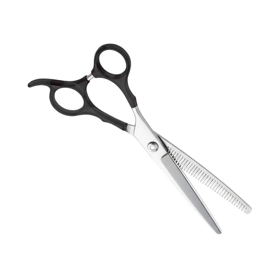 กรรไกรตัดผมบางด้ามจับสีดำทำจากสแตนเลสกรรไกรตัดผม
