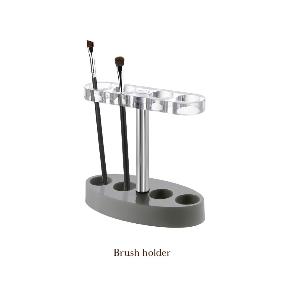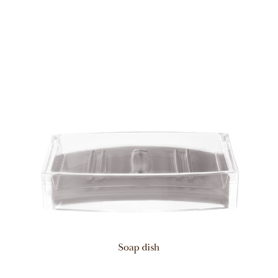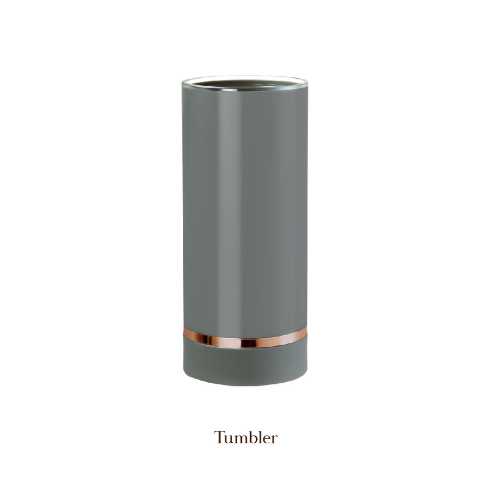 ชุดอุปกรณ์เสริมพลาสติกสีเทาสีโรสโกลด์ในห้องน้ำที่ใส่สบู่ที่ใส่แปรงสีฟันที่ใส่สบู่ที่จ่ายโลชั่นในห้องน้ำ