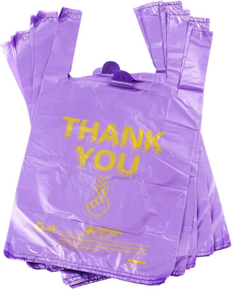 ถุงพลาสติกใส่ของชำ เสื้อยืดขอบคุณ ถุงช้อปปิ้งพลาสติกสำหรับธุรกิจขนาดเล็ก ถุงใส่อาหารแบบมีหูหิ้ว