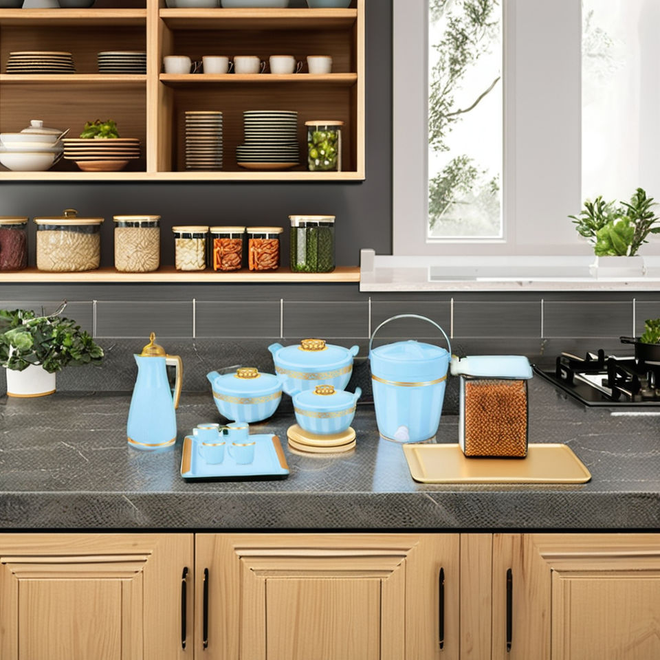 Contents- 9 pcs:Casseroles- 3 pcs, Flask- 1 pc, Spoon- 2 pcs, Dinner Plate- 3 plates