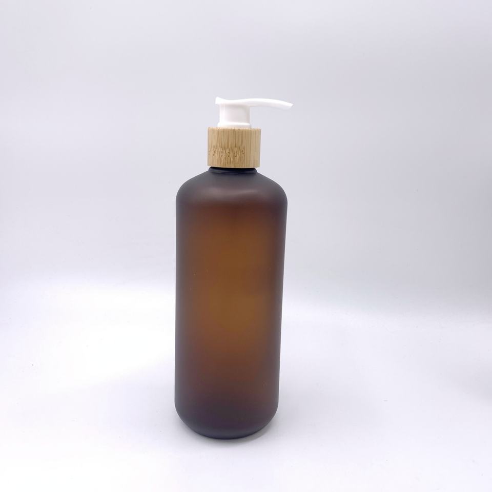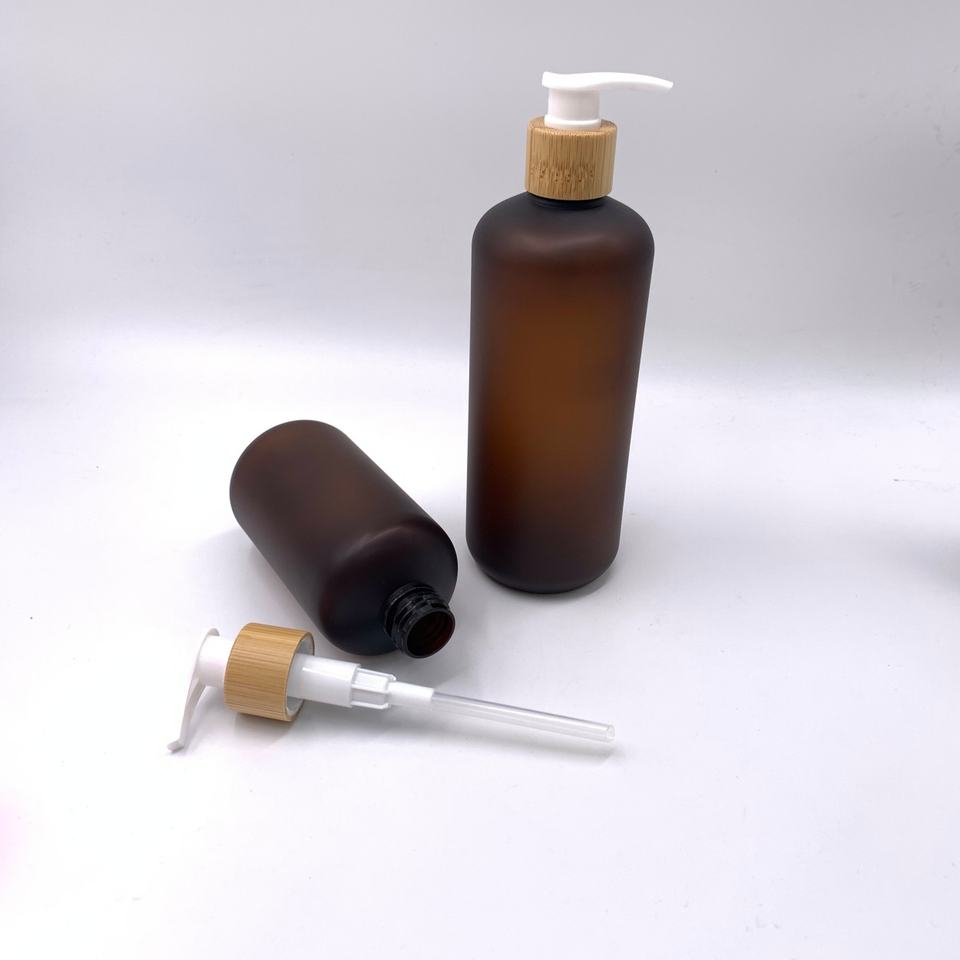 ขวดโลชั่นพลาสติกขนาดเล็ก 60 มล. 120 มล. 250 มล. ขวดแชมพู PET สีเหลืองอำพันขุ่น บรรจุภัณฑ์พร้อมฝาไม้ไผ่