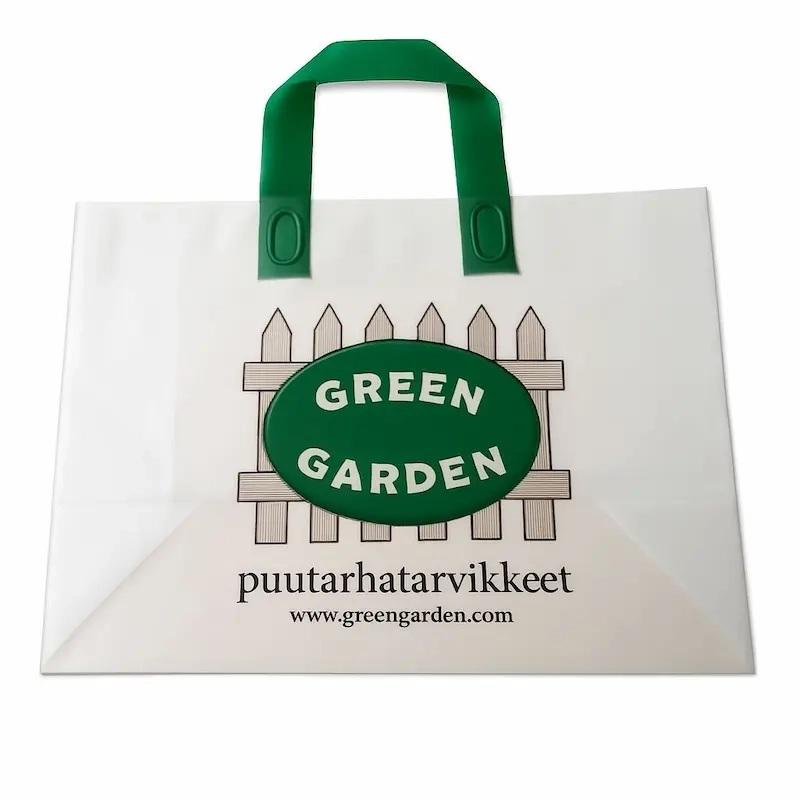 ถุงช้อปปิ้งพลาสติกแบบหูหิ้วนิ่ม เป็นมิตรกับสิ่งแวดล้อม มีฐานรอง รับทำโลโก้ตามสั่ง และวัสดุทนทาน