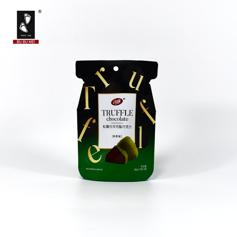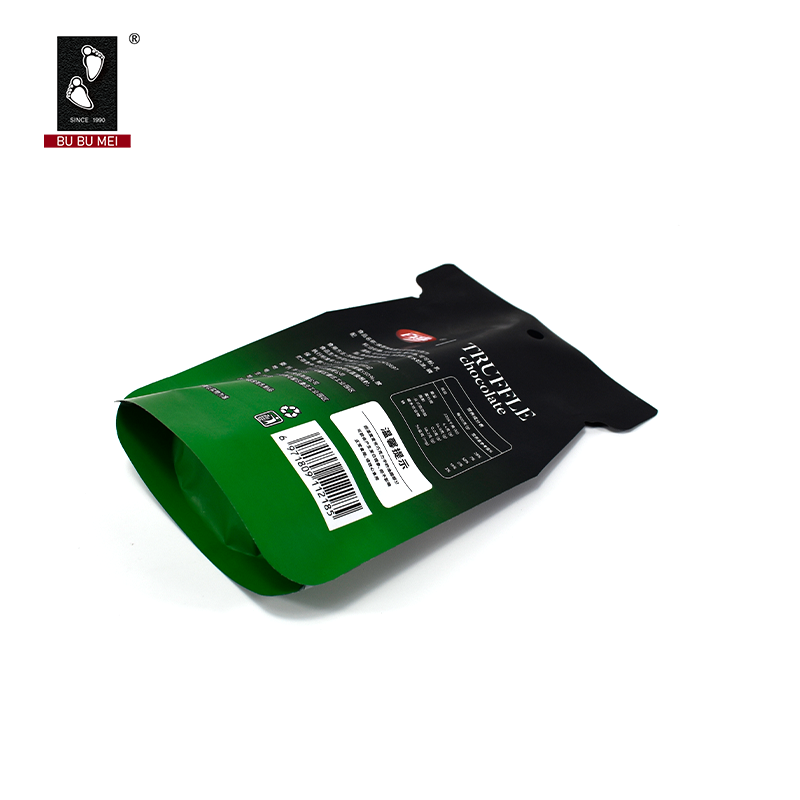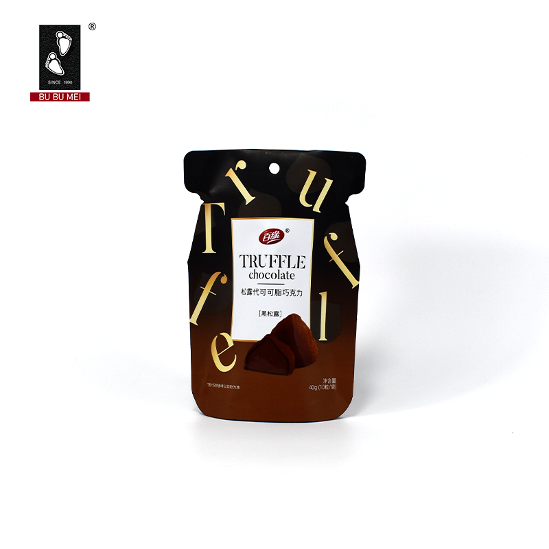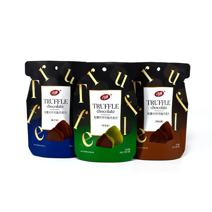 กระเป๋าพลาสติกแบบตั้งได้พร้อมช่องหน้าต่างหรูหราและกันความชื้นสำหรับถั่วลูกอมช็อคโกแลตพร้อมซิปกันเด็ก