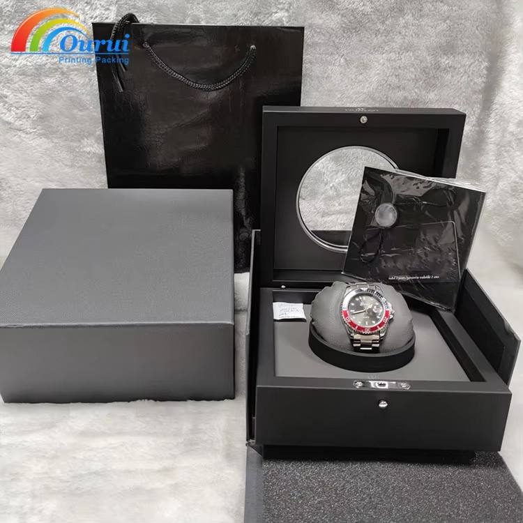 กล่องใส่นาฬิกาพลาสติก โลโก้สั่งทำ ภายในบุหนัง ทรงสี่เหลี่ยม บรรจุภัณฑ์ภายนอกหรูหรา วัสดุรีไซเคิล สีดำ