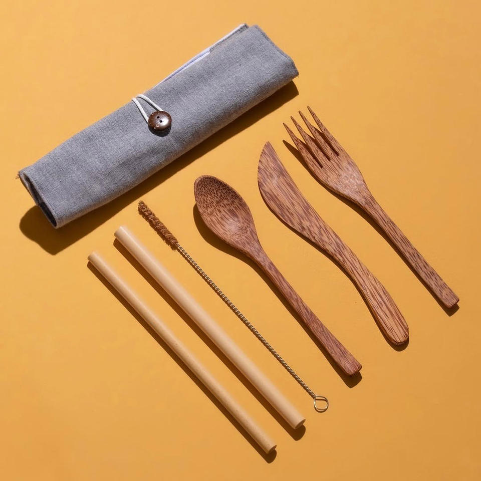 ชุดช้อนส้อมพลาสติกรูปมะพร้าวธรรมชาติพร้อมกระเป๋าอุปกรณ์สำหรับเดินทางและตั้งแคมป์