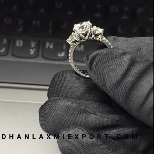 แหวนหมั้นเพชรแพลตตินั่ม 3 เม็ดทรงกลม พร้อมวงแหวนประดับเพชรแบบ Pave Band รับรองโดย IGI เครื่องประดับเจ้าสาวสุดหรูจากกูจารัต