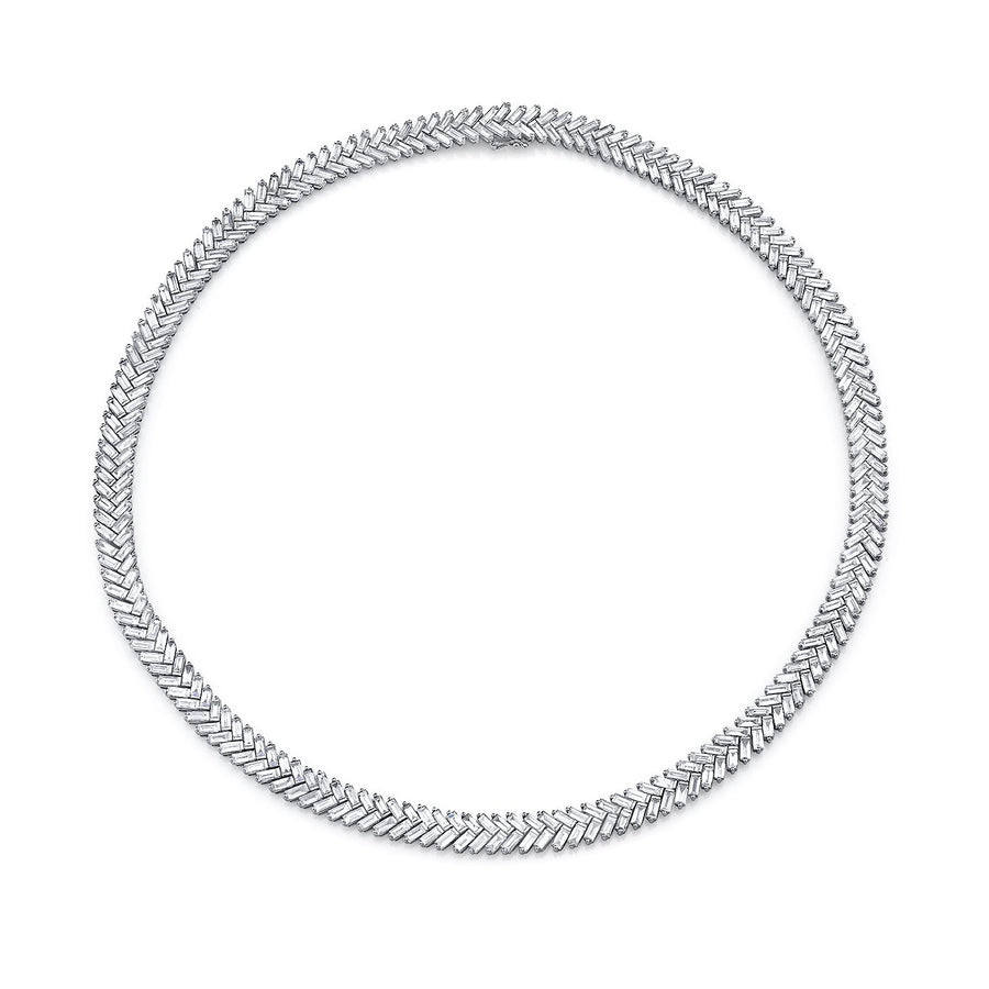 สร้อยคอเพชรทรงบาแกตต์เพลตตินั่ม เพชรเลี้ยงในห้องปฏิบัติการ แบบซิป สร้อยคอเทนนิส สำหรับเจ้าสาว รับผลิตแบบ OEM ขายส่ง ขายปลีก ผู้ผลิตเครื่องประดับ