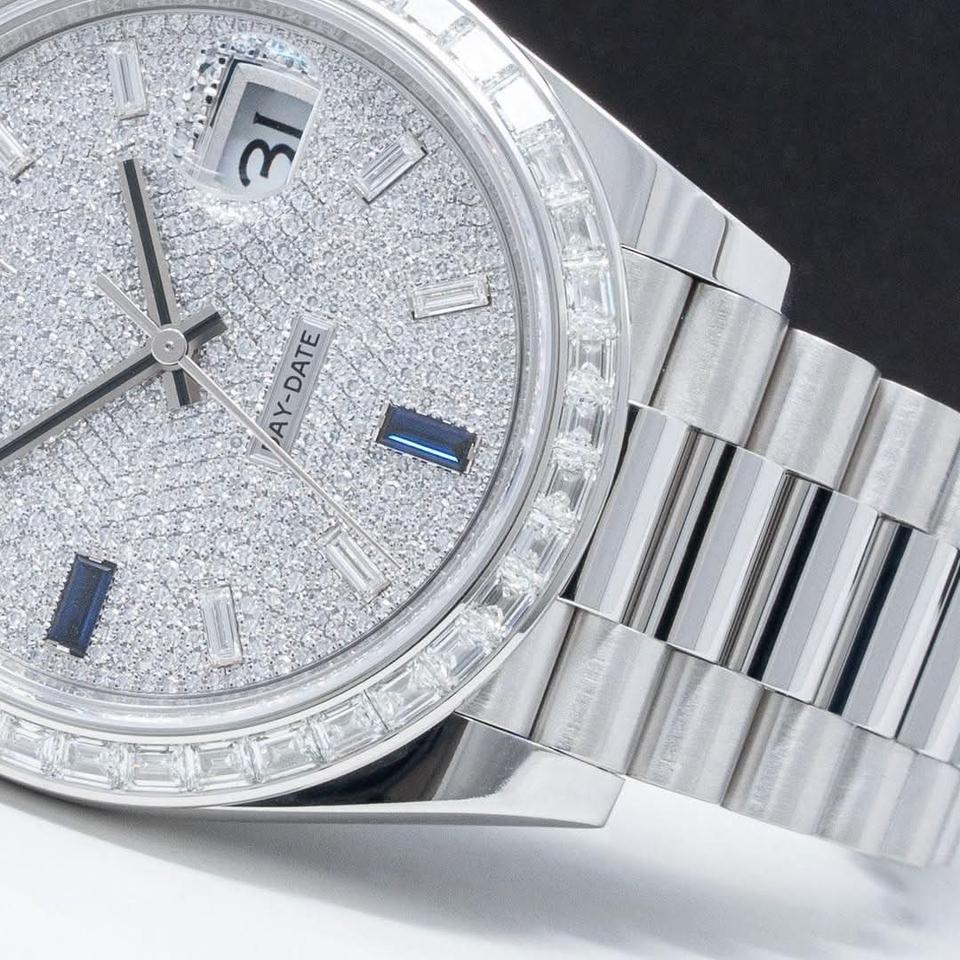 หน้าปัดประดับเพชรแพลตตินั่ม พร้อมขอบตัวเรือนแซฟไฟร์และเพชร นาฬิกาข้อมือสแตนเลสสตีลสุดหรู รุ่นลิมิเต็ดอิดิชั่น ดีไซน์ทันสมัย
