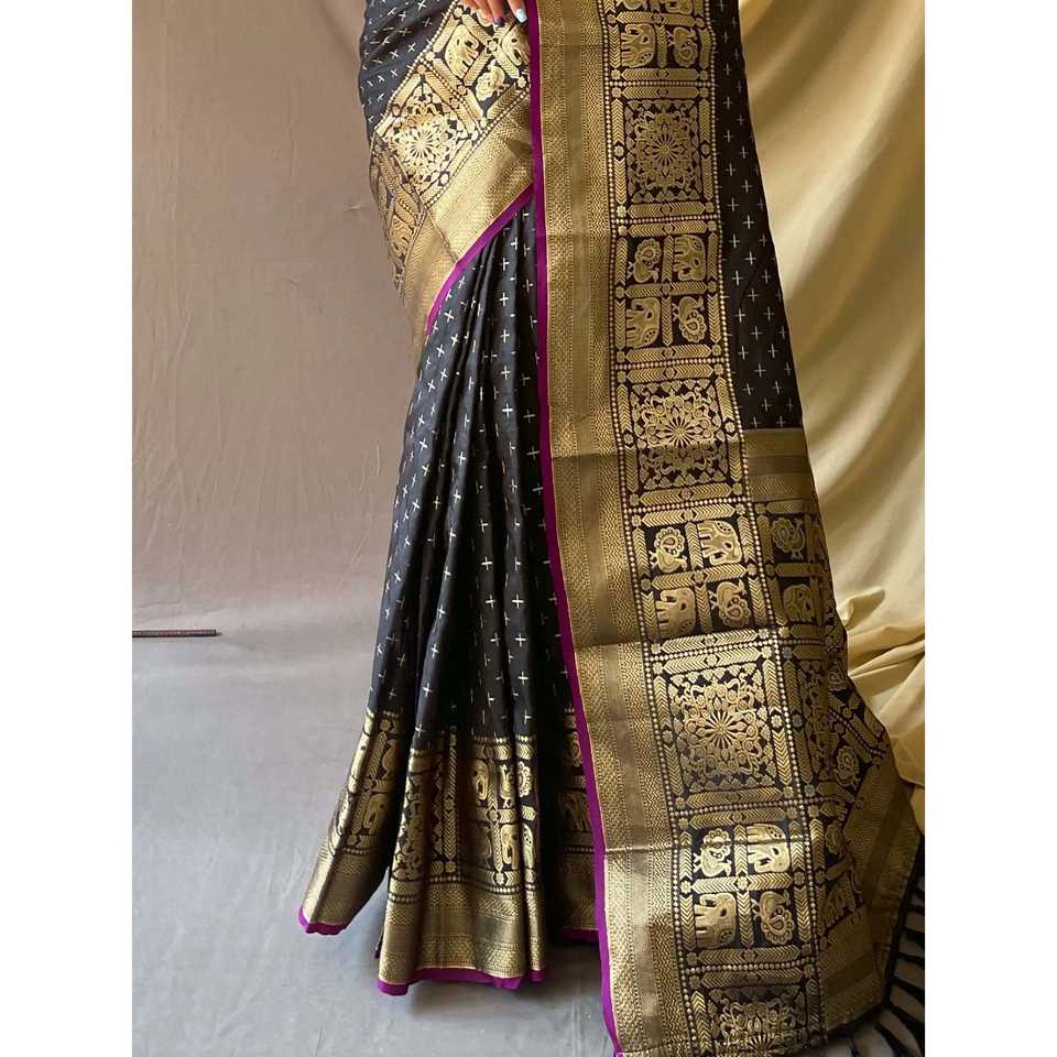 ผ้าไหมซาหรีสีดำทอลายซารีสวยงาม พร้อมเสื้อคลุมสำหรับงานแต่งงาน