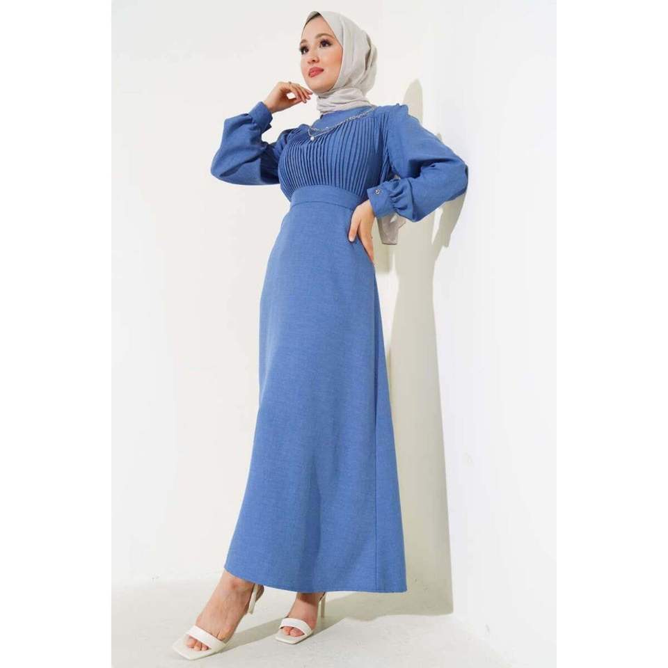 ชุดผ้าลินินจีบด้านหน้าสีฟ้า