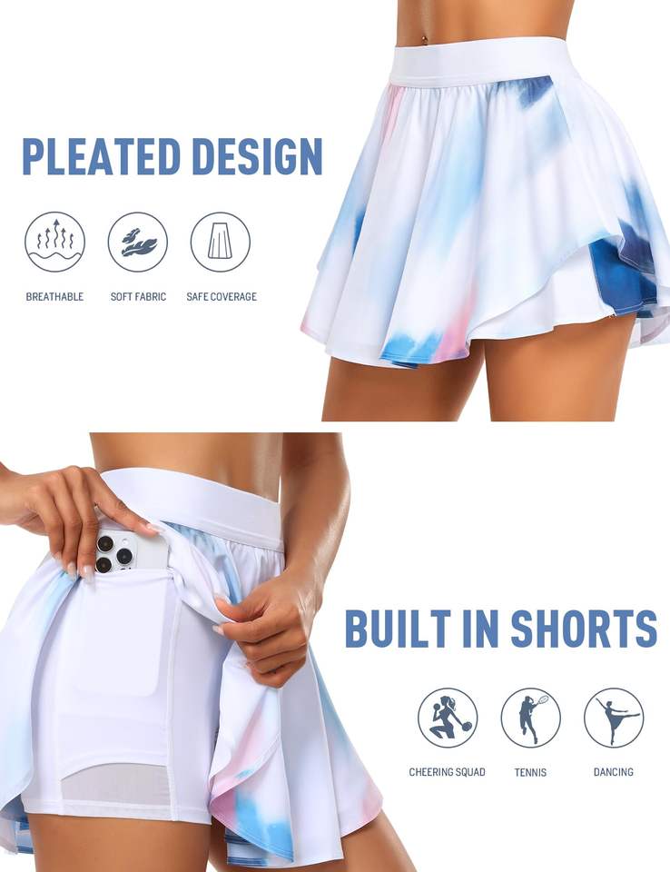 กระโปรงเทนนิสทรงพลีทพร้อมกางเกงขาสั้นในตัว และกางเกงขาสั้นเอวสูงสำหรับผู้หญิงแบบมีปกตกแต่งด้วยลูกไม้สำหรับออกกำลังกาย