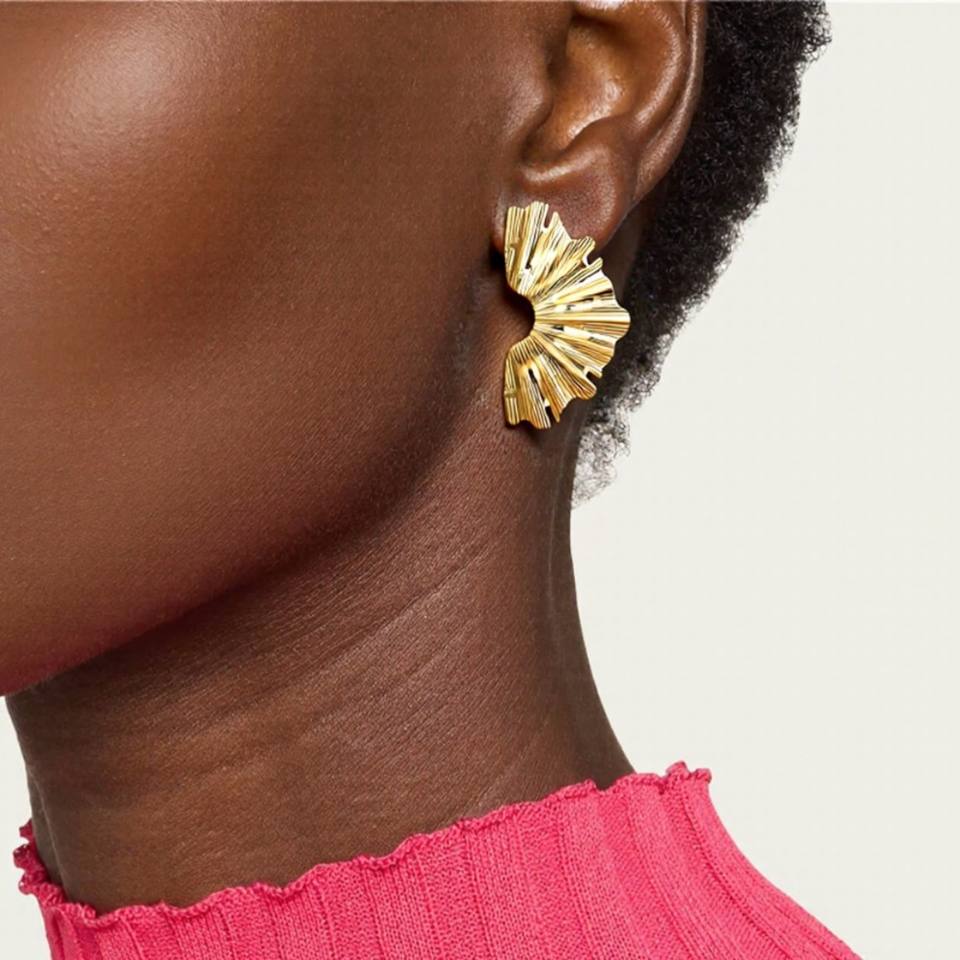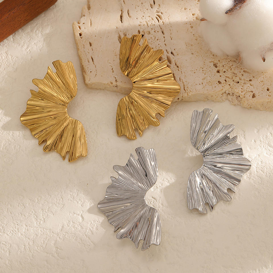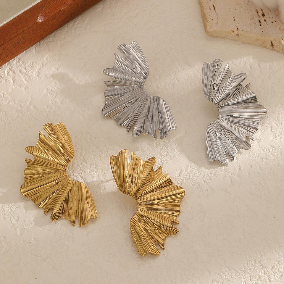 ต่างหูสตั๊ดเหล็กไทเทเนียมลายจีบสำหรับผู้หญิง 18k ทองคำเปลว สแตนเลสสตีล เครื่องประดับแฟชั่น ดีไซน์รูปใบไม้