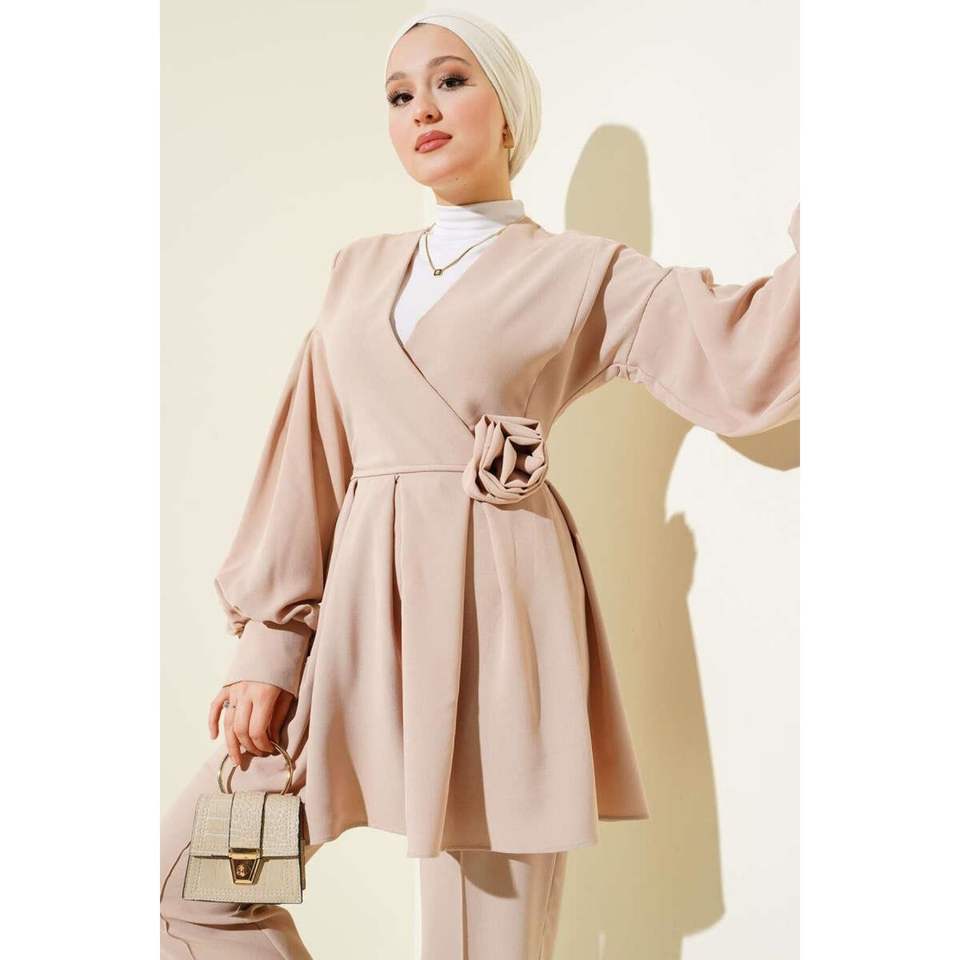 เสื้อคลุมจีบชุด2ชิ้นสีเบจพร้อมอุปกรณ์เสริมกุหลาบ
