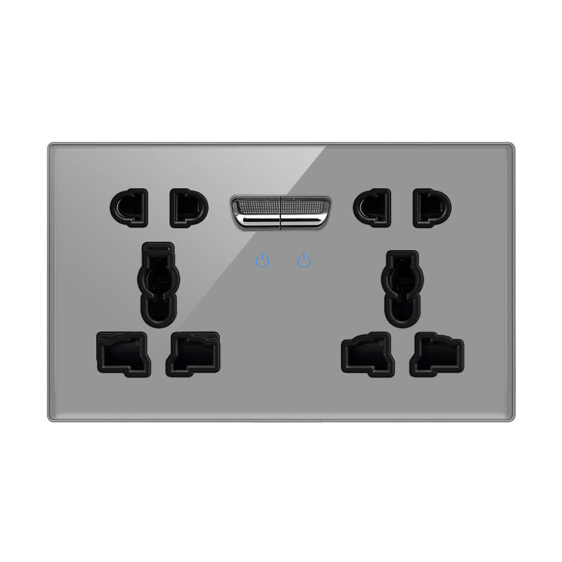 ปลั๊กกระจกเทมเปอร์อเนกประสงค์พร้อมช่องเสียบผนัง USB เต้าเสียบคู่พร้อมช่องเสียบกระจกสีเทาแบบ LED