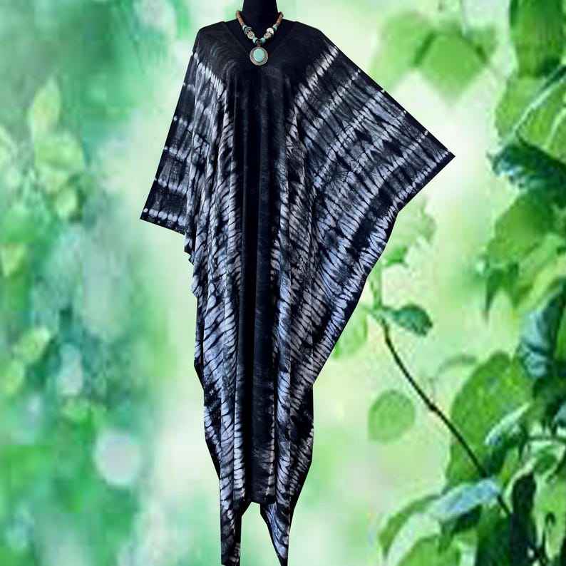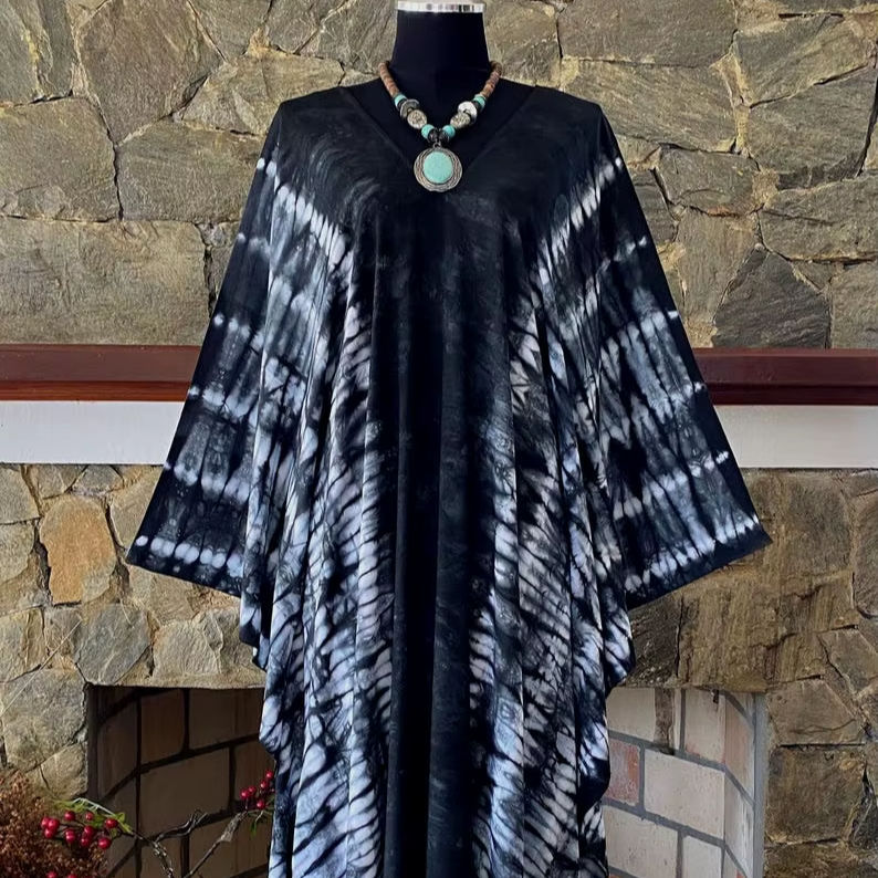 เดรสคาฟทันผ้าเรยอนสีดำไซส์ใหญ่ ลายมัดย้อมสไตล์ชิโบริ ทรงหลวม สไตล์โบฮีเมียน ชุดคลุมชายหาดแบบยาว