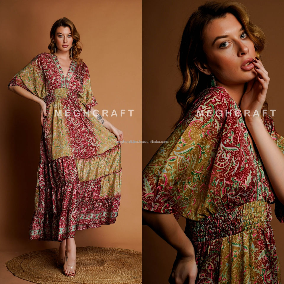 เดรสแม็กซี่คอวีพิมพ์ลายดอกไม้โบฮีเมียนขนาดพลัสไซส์เป็นมิตรกับสิ่งแวดล้อม