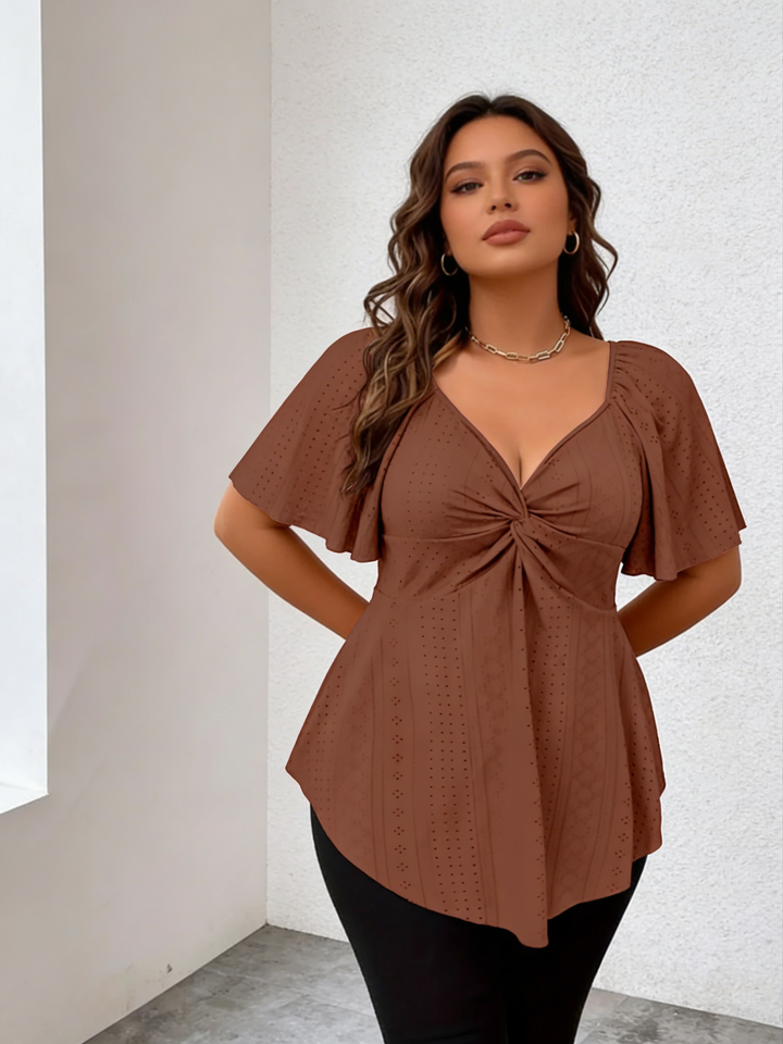 เสื้อเปปลัมคอวีสีน้ำตาลช็อกโกแลตไซส์ใหญ่ แต่งระบายด้านหน้า แขนระบายปักลายตาไก่ ชายเสื้อไม่สมมาตร