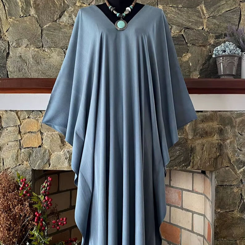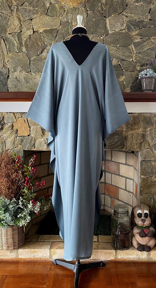 เดรสยาวคอวีผ้าเรยอนสีเทาอมฟ้าย้อมมือไซส์พลัส