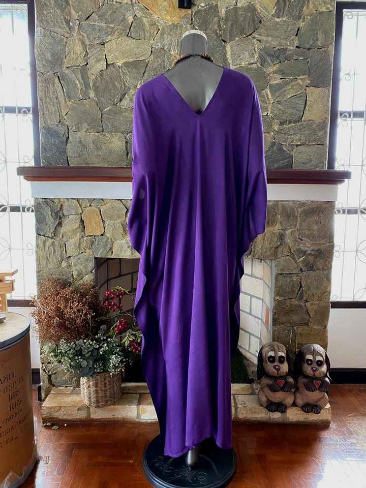 เดรสคาฟทันผ้าเรยอนสีม่วงย้อมมือ ไซส์พลัส คอวี ทรงหลวม สวมใส่สบาย