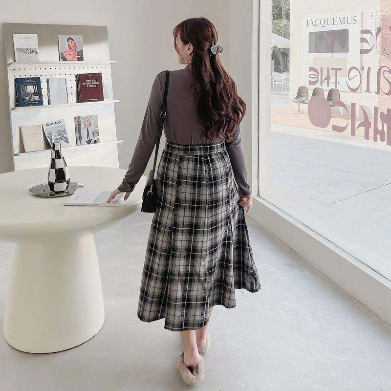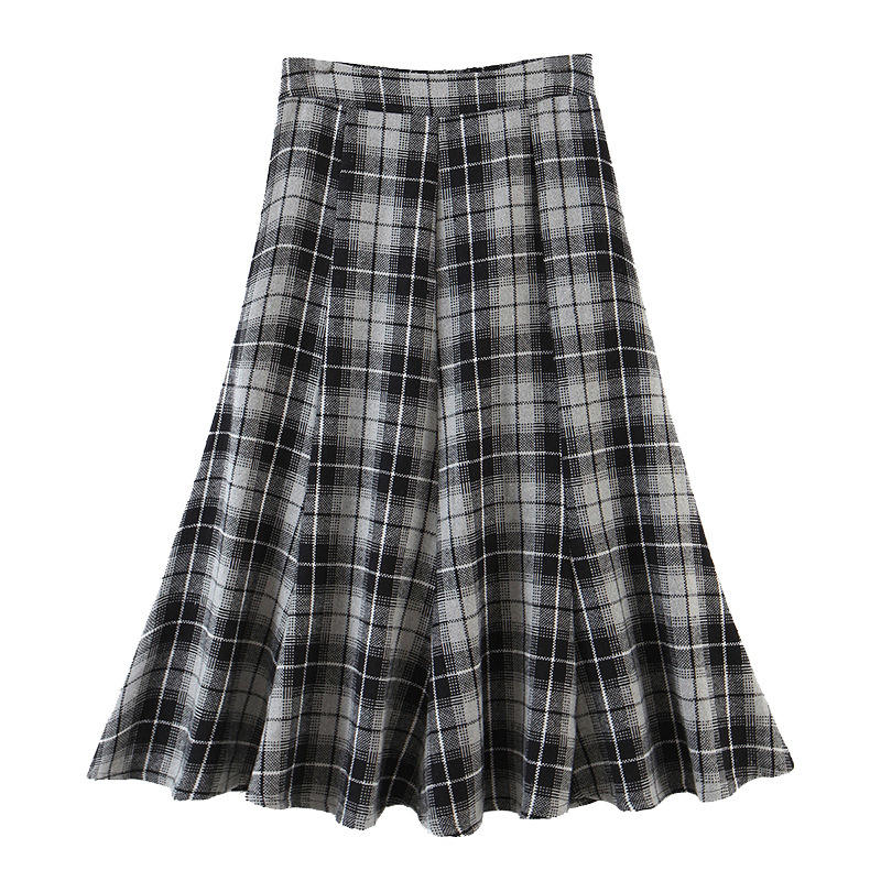 กระโปรงมิดิลายสก๊อตเอวสูงขนาดพลัสไซส์ผู้หญิงผ้าฝ้ายสีดำและสีเทากระโปรงยาวลายตารางพร้อมป้าย N7856