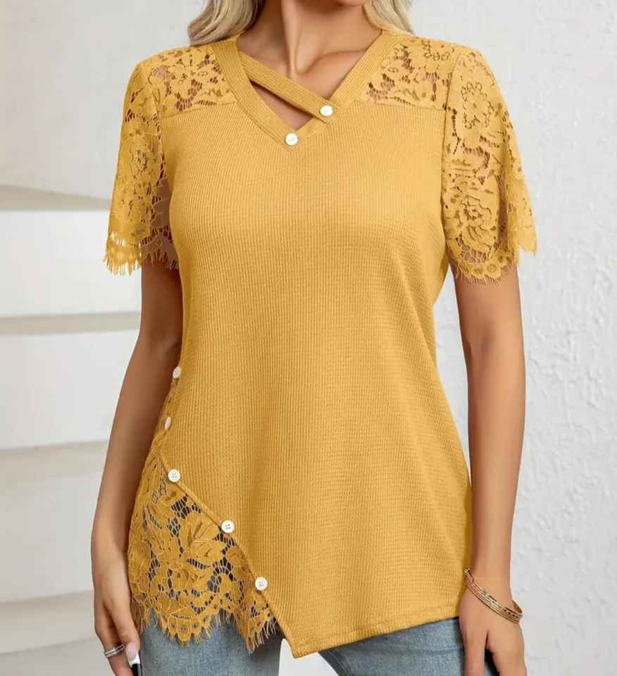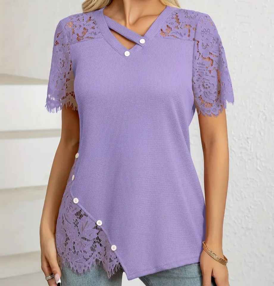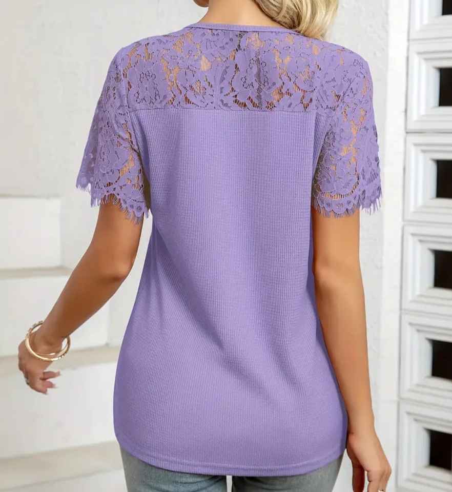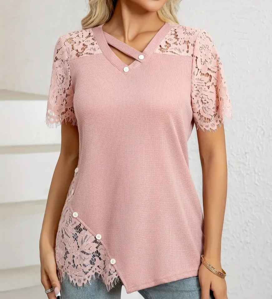 เสื้อเบลาส์คอกลมเย็บลูกไม้ขนาดใหญ่พิเศษเสื้อลำลองแขนสั้นสำหรับฤดูใบไม้ผลิและฤดูร้อนเสื้อผ้าขนาดใหญ่พิเศษของผู้หญิง