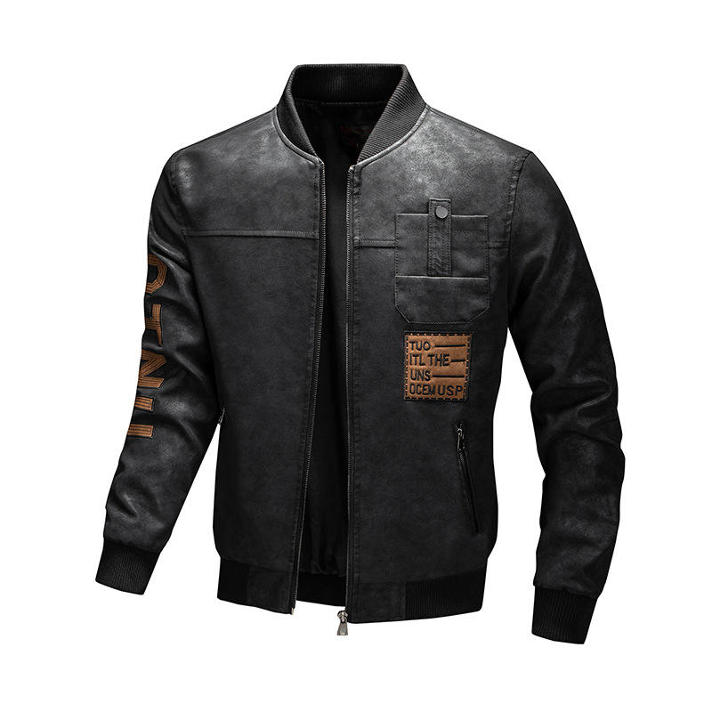 เสื้อแจ็คเก็ตหนัง PU สำหรับผู้ชายไซส์ใหญ่ คอตั้ง กันลม สไตล์วาร์ซิตี้ ซับในผ้าฟลีซ รับผลิตแบบ OEM