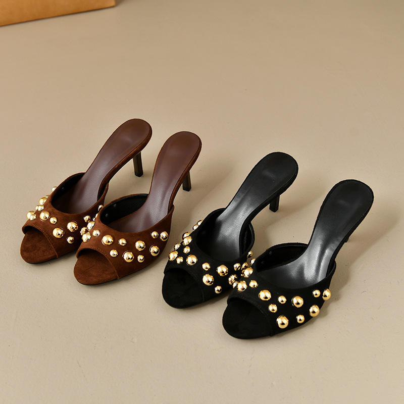 รองเท้าส้นสูงติดหมุดสุดเซ็กซี่ขนาดใหญ่พิเศษสำหรับผู้หญิงทำจากหนังกลับรองเท้าส้นเข็มทรงปากปลาหรูหราสำหรับฤดูร้อน