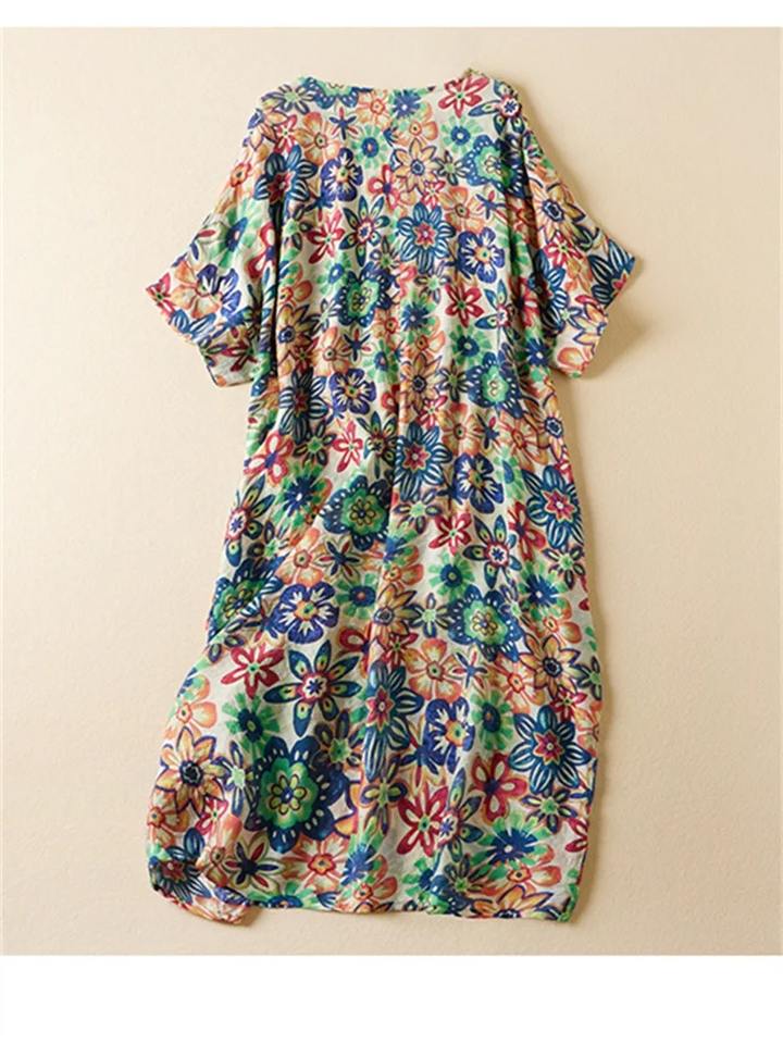 ชุดเดรสลายดอกไม้วินเทจเม็ดใหญ่สำหรับผู้หญิงชุดเดรสลำลองผ้าลินินพิมพ์ลายดอกไม้แบบหลวมสำหรับฤดูร้อน