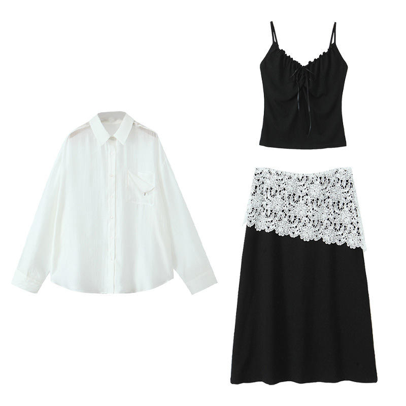 เสื้อสายเดี่ยวสีดำ, กระโปรงมิดิสีดำ, เสื้อเชิ้ตสีขาว