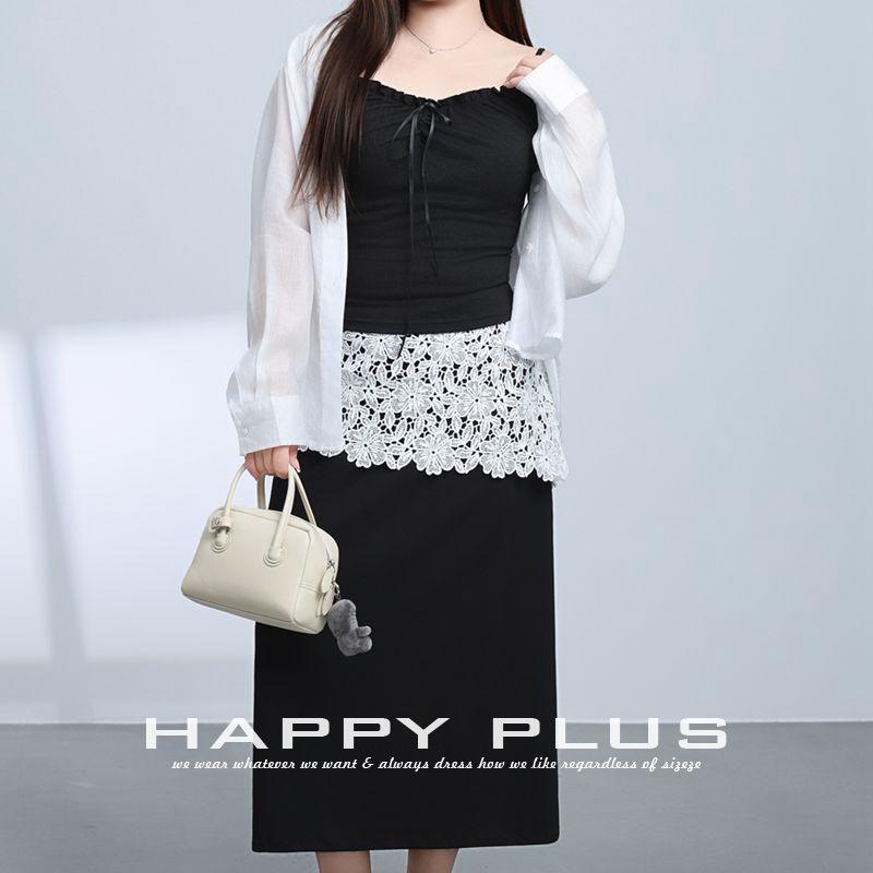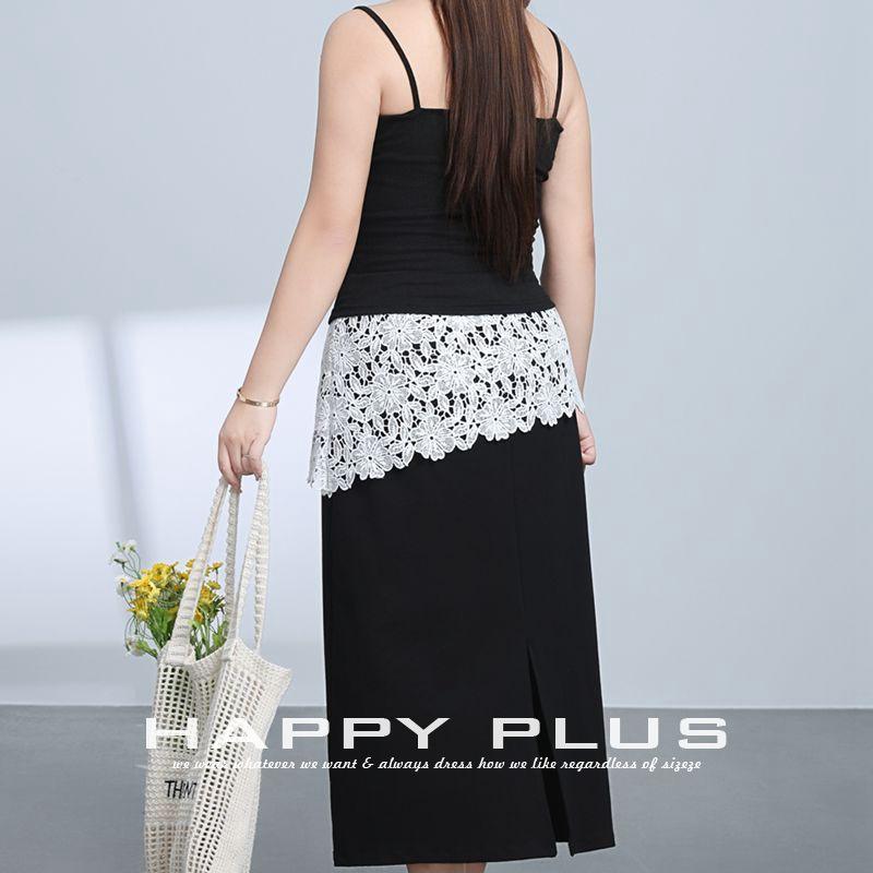 กระโปรงทรงเอไลน์แต่งลูกไม้สำหรับสาวพลัสไซส์ สีดำล้วน เอวธรรมชาติ สไตล์พรีปปี้ลำลอง รุ่น N9288