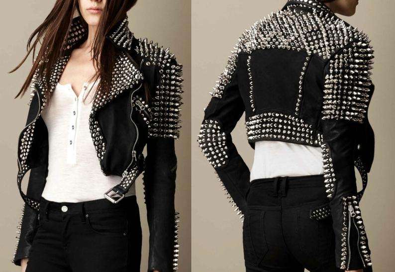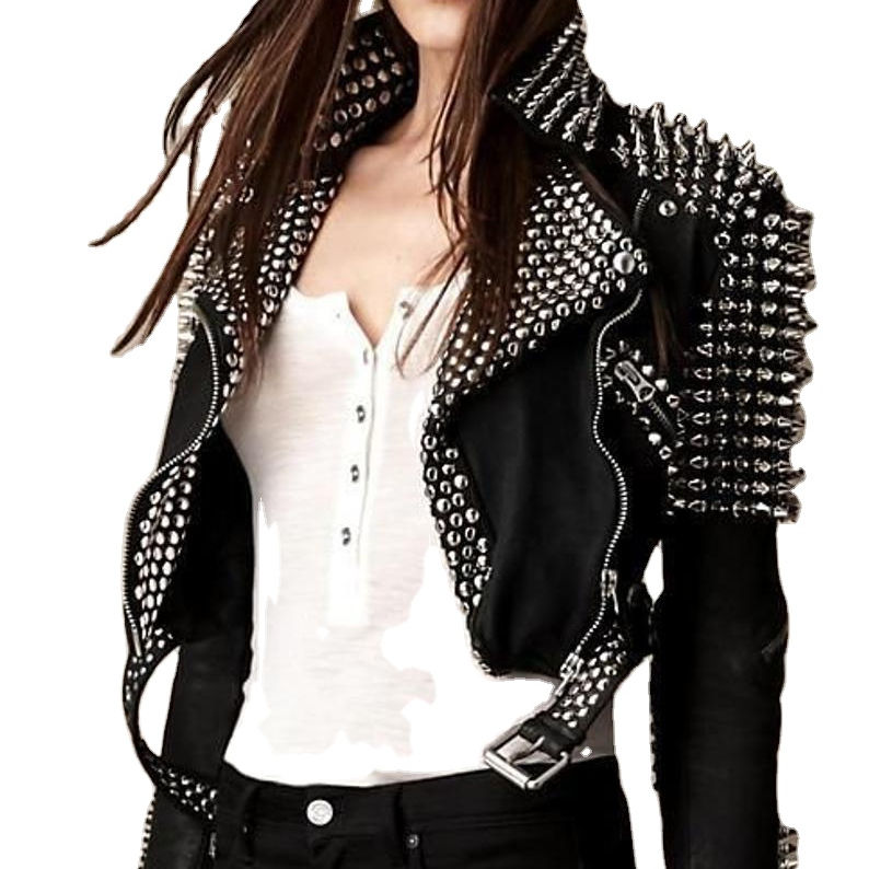 แจ็กเก็ตหนังแต่งหมุดขนาดใหญ่ของผู้หญิง,เสื้อโค้ทแฟชั่นร็อคล้างด้วยหมุด PU สำหรับขี่มอเตอร์ไซค์สีดำฤดูใบไม้ผลิใหม่