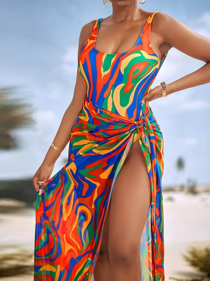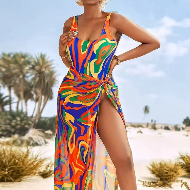 เดรสคล้องคอแบบมีเชือกรูดด้านหน้าสำหรับผู้หญิงชุดเดรสเซ็กซี่สายเดี่ยวพิมพ์ลายชายหาดใหม่สำหรับฤดูร้อน2025