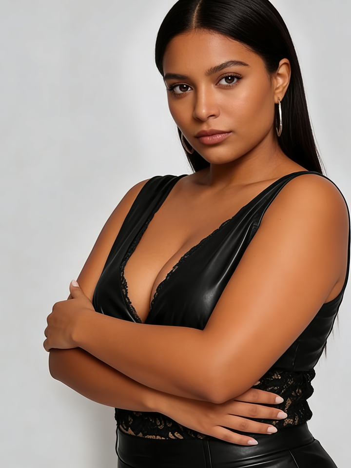 เดรสสั้นรัดรูปหนังเทียมสีดำสำหรับสาวพลัสไซส์ - เดรสปาร์ตี้ฤดูร้อนแบบเซ็กซี่ คอวี แต่งลูกไม้ แขนกุด