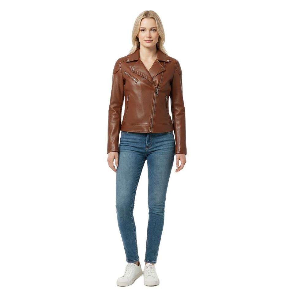 เสื้อแจ็คเก็ตหนังแท้สีน้ำตาลสำหรับผู้หญิงไซส์ใหญ่ - ตัดเย็บตามสั่ง - ขายส่งจำนวนมาก - สไตล์นักขี่มอเตอร์ไซค์จากโรงงาน