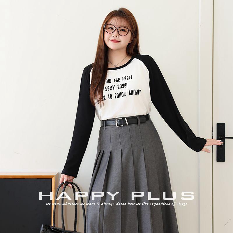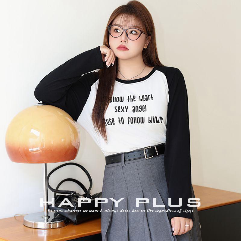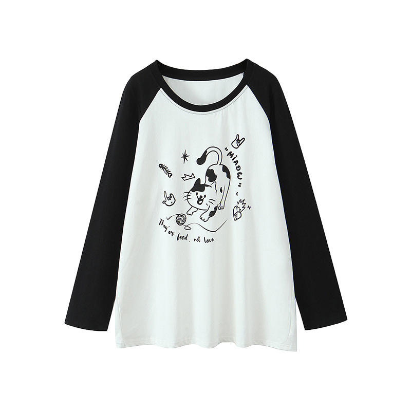 เสื้อยืดแขนยาวพิมพ์ลายแมวสำหรับผู้หญิงไซส์ใหญ่ แขนเสื้อแบบแร็กแลน เสื้อถักลำลองพร้อมลายตัวอักษรสำหรับผู้ใหญ่