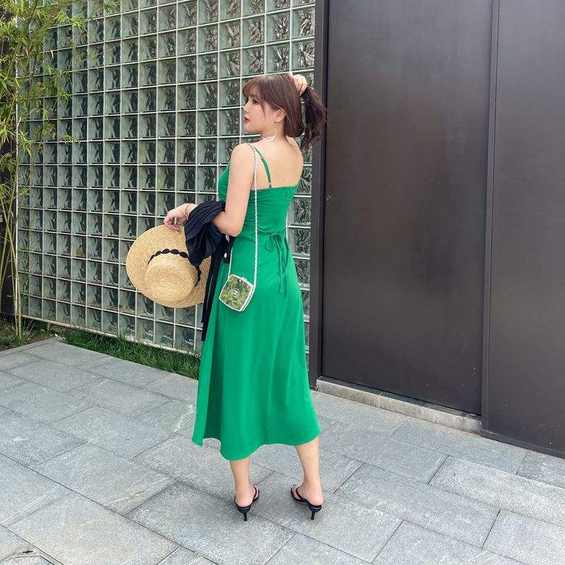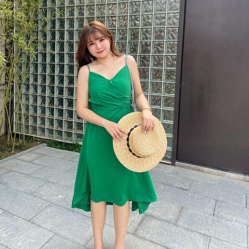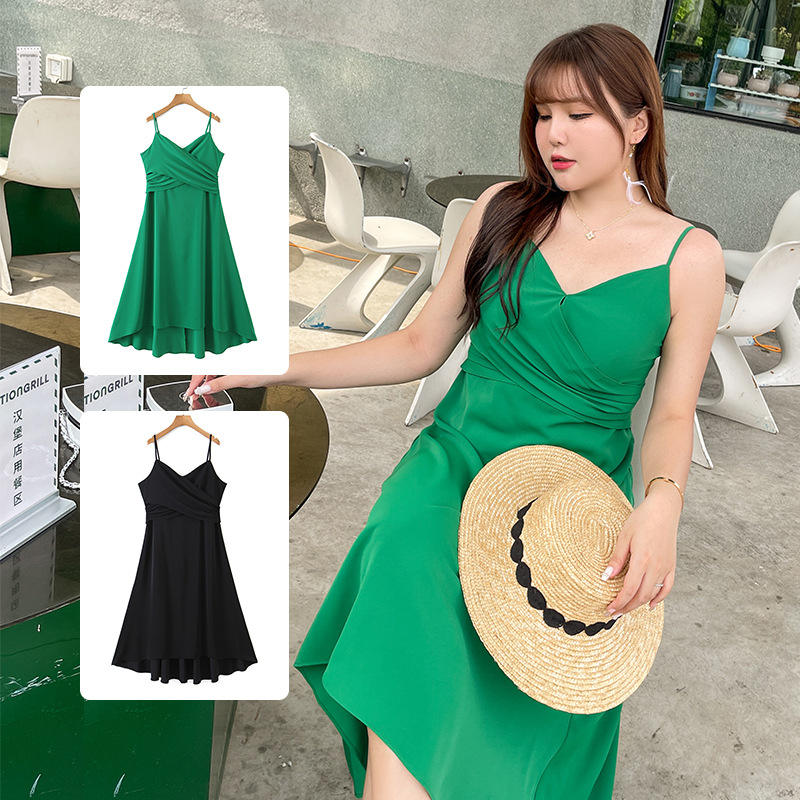เดรสชีฟองทรงเอไลน์สำหรับผู้หญิงไซส์ใหญ่ คอแบบผูกเอวธรรมชาติ สีเขียว สีดำ จับจีบแบบไขว้ รุ่น N8429