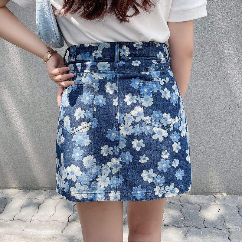 กระโปรงผ้ายีนส์ทรงเอไลน์สำหรับผู้หญิงขนาดใหญ่พิเศษกระโปรงผ้าฝ้ายสีน้ำเงินเข้มลายดอกไม้ N8079