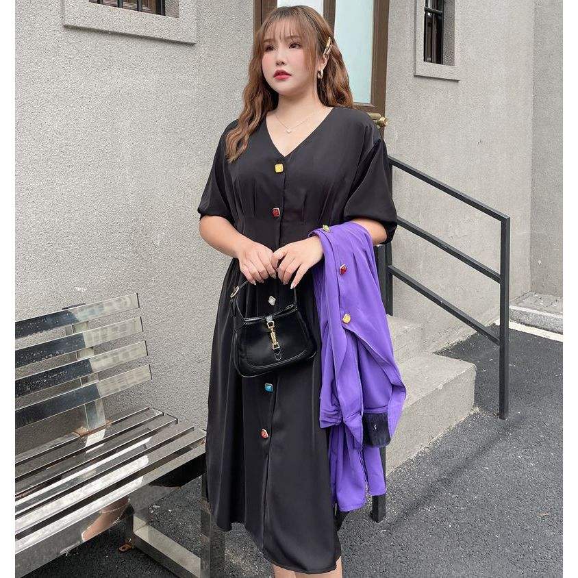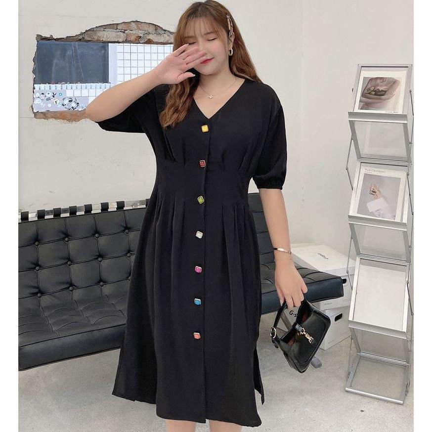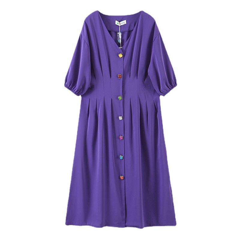 ชุดเดรสคอวีหรูหราขนาดใหญ่พิเศษของผู้หญิงสีทึบพร้อมกระดุมหลากสีดีไซน์รัดเอว (N7982)