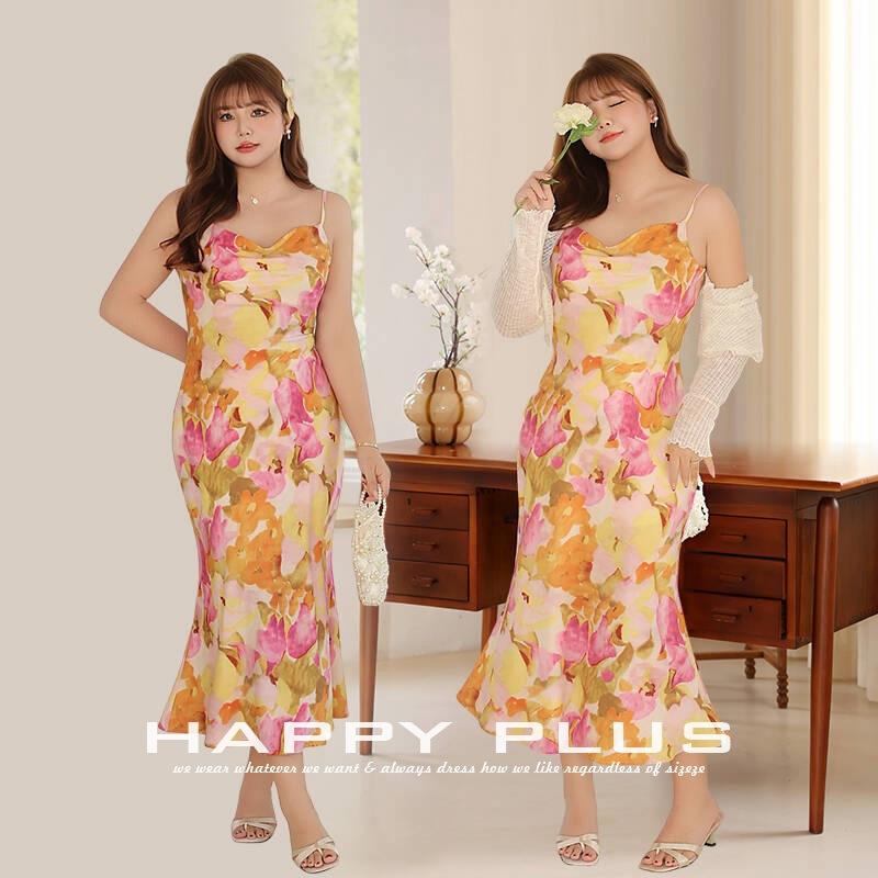 เดรสสายเดี่ยวพิมพ์ลายดอกไม้สำหรับสาวพลัสไซส์ คอระบาย เอวธรรมชาติ ตัดเย็บแบบไบแอส ด้านหลังเปลือย