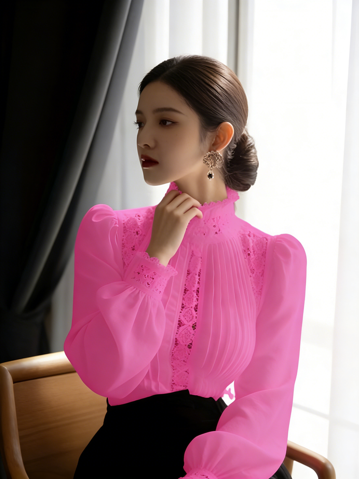 เสื้อเบลาส์คอสูงแต่งลูกไม้สีบานเย็นสำหรับผู้หญิงไซส์พลัส - เสื้อชีฟองจีบระบายแขนบิชอปทรงพอง ดีไซน์หรูหรา เหมาะสำหรับใส่ในโอกาสทางการและลำลอง