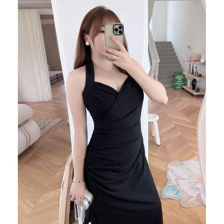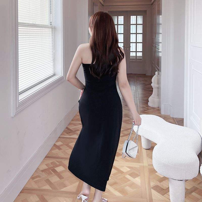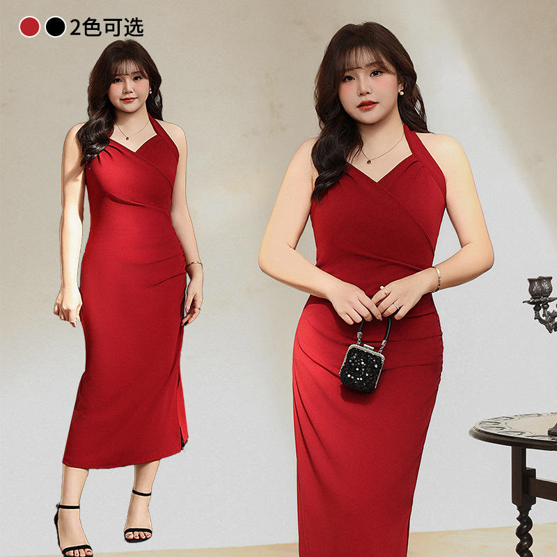 เดรสสายเดี่ยวคอปกสำหรับผู้หญิงไซส์ใหญ่ เอวธรรมชาติ สีดำ สีแดง โพลีเอสเตอร์ N8425